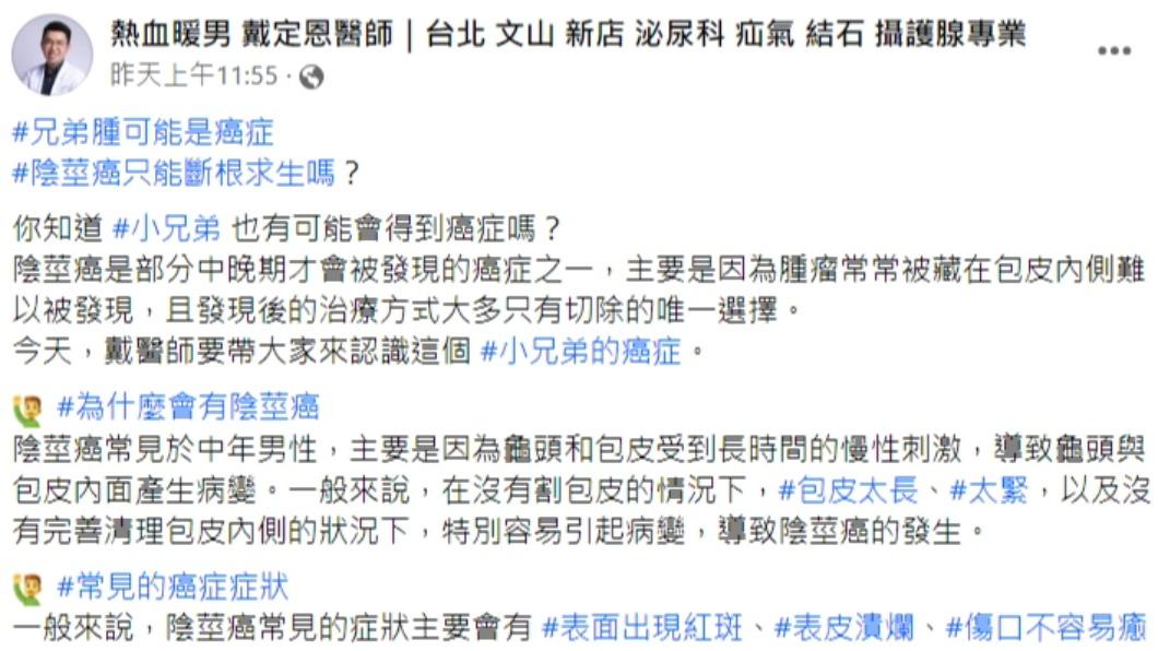 粉專發文科普,陰莖癌是部分中晚期才會被發現的癌症之一,主要是因為腫瘤常常被藏在