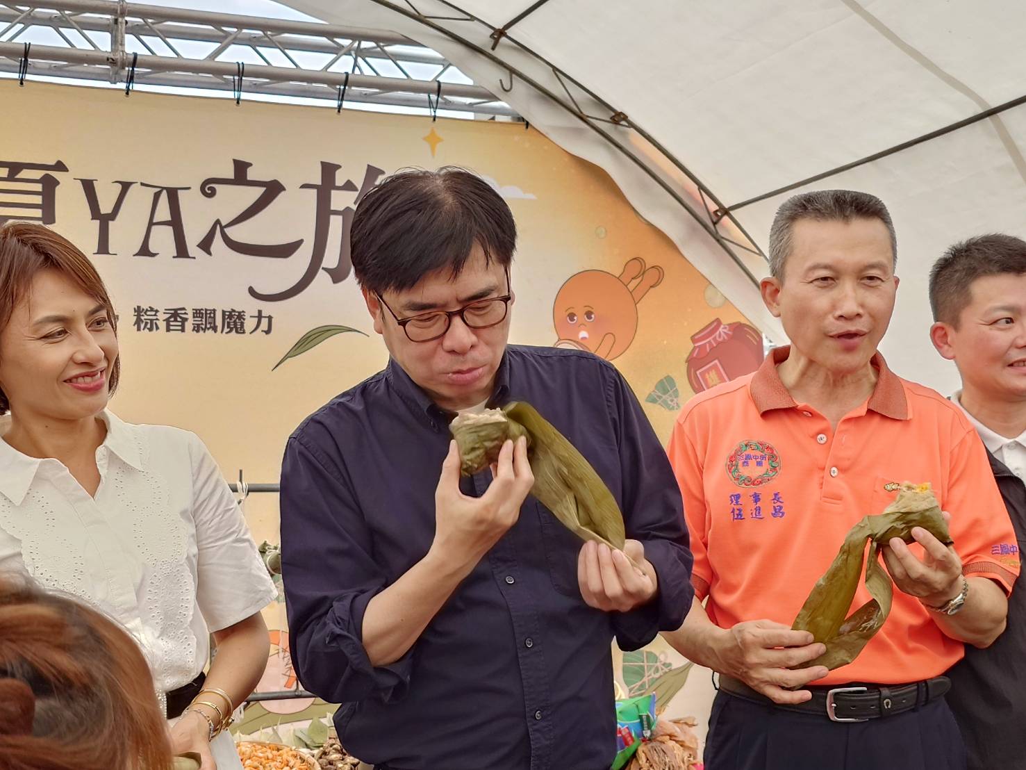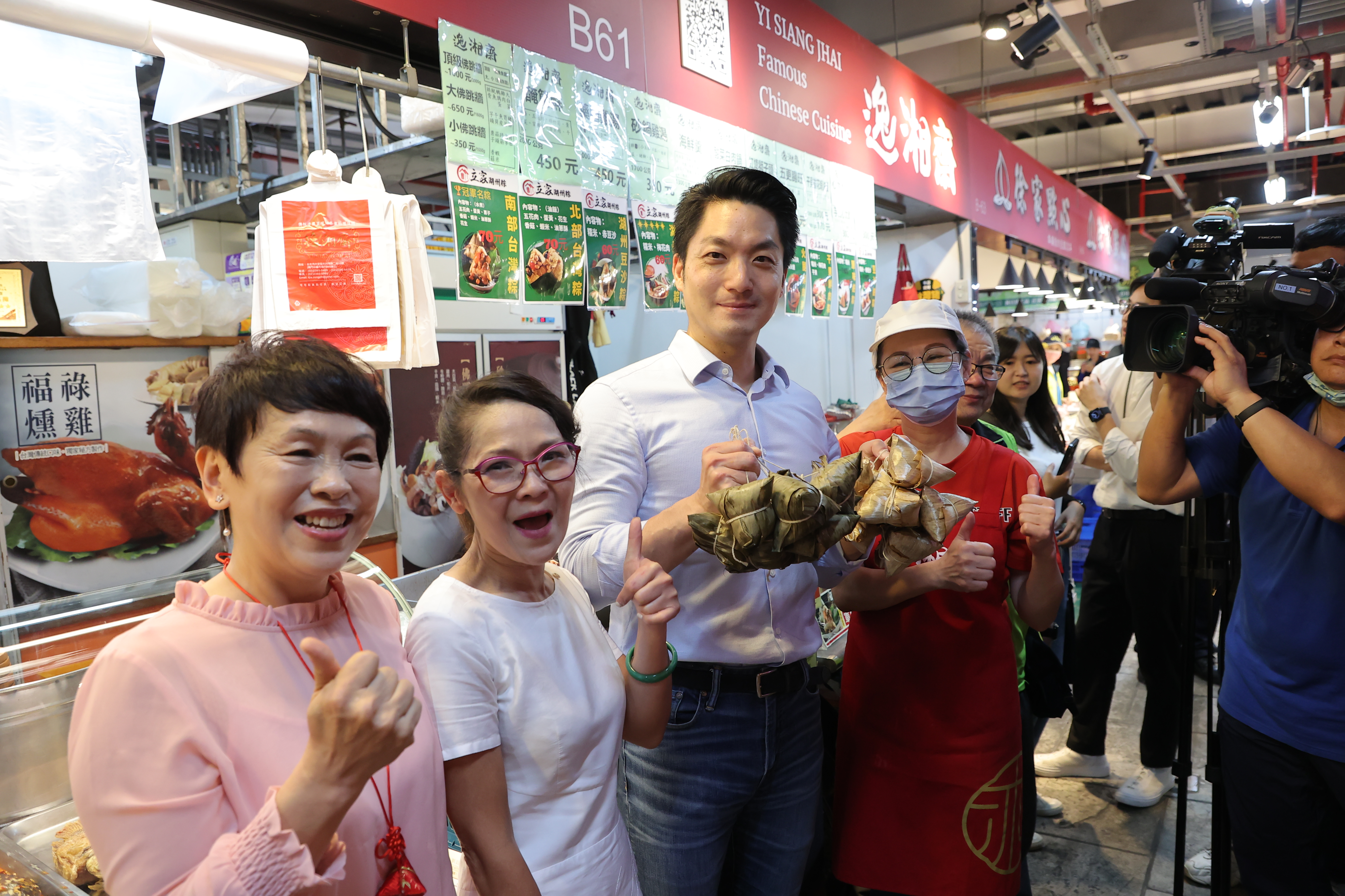 台北市長蔣萬安(中)8日參加台北市南門中繼市場「百粽宴」 時說,他非常喜歡北部粽