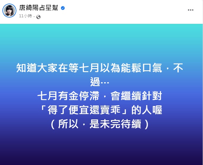 唐綺陽昨深夜在臉書發文表示,知道大家都在等7月以為能鬆一口氣,但是她提及7月有金