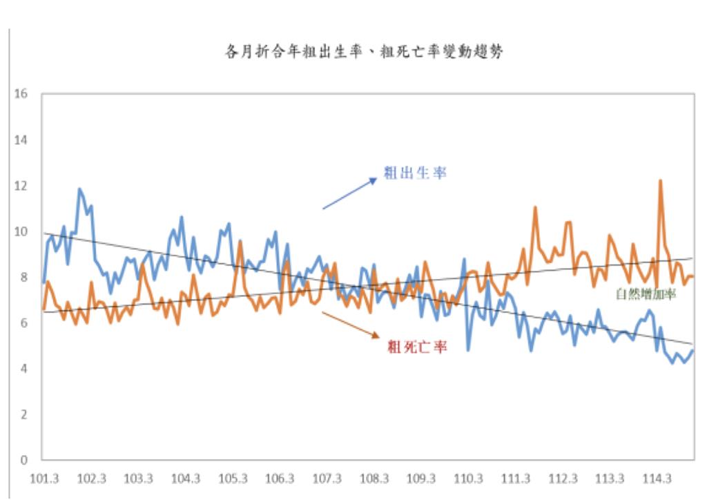 各月折合年粗出生率、粗死亡率變動趨勢。圖/內政部提供