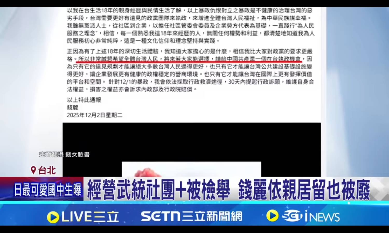 最新消息,移民署2日證實,錢麗於依親居留期間之行為,「有危害國家安全或社會安定