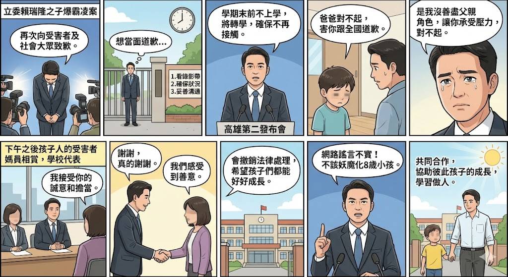 立委賴瑞隆兒子爆發校園霸凌案,今天下午二度召開記者會致歉,但當時尚未見到受害女