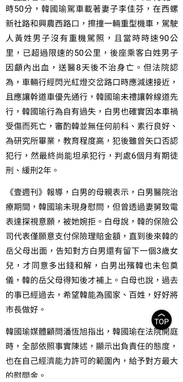貼個thread下面的回文 我笑死 謝謝阿苗讓我好奇去查資料 我剛去查韓國瑜撞死的那個 是無照+在50公里限速騎到快100公里 闖紅燈撞到韓國瑜自摔 他載的後座乘客因此摔死 結果你去脈絡變成韓國瑜是 …229F 128推 14噓- 14F 4推 1噓