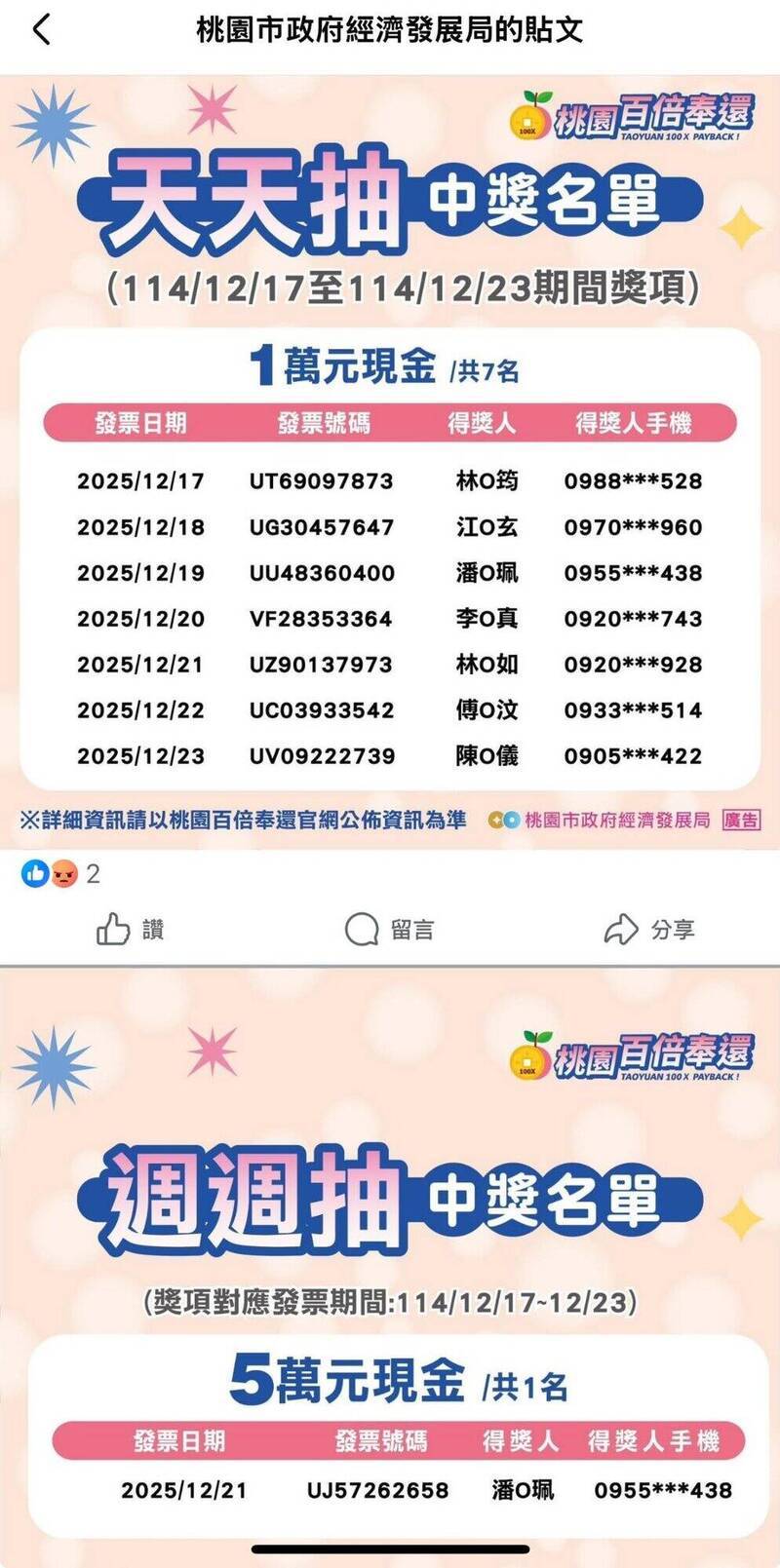 「桃園百倍奉還」活動,同一人成為天天抽1萬、週週抽5萬得主,網友質疑「是運氣爆棚 ?還是有黑箱?」。(經發局提供) 桃園市政府經濟發展局主辦「普發一萬・桃園百倍奉還」活動,希望帶動年終消費熱潮, 隨 …55F 30推 3噓