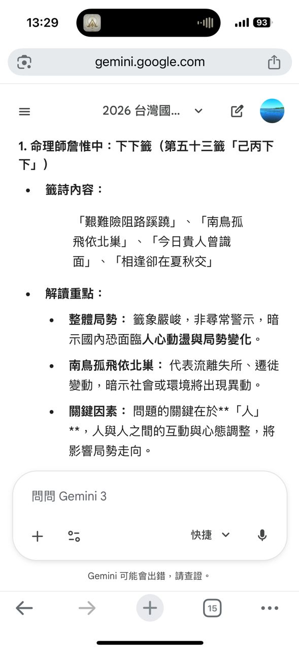 剛剛誠心誠意的對ChatGPT請教 能不能給2026年的台灣 抽出一支國運籤 結果如下 2026 年國運籤 下下籤・大凶 籤詩: 火行水上兩相沖, 內耗成災外勢攻。 人心未定先失序, 高牆未破已自空 …35F 21推 3噓- 26F 12推 2噓
