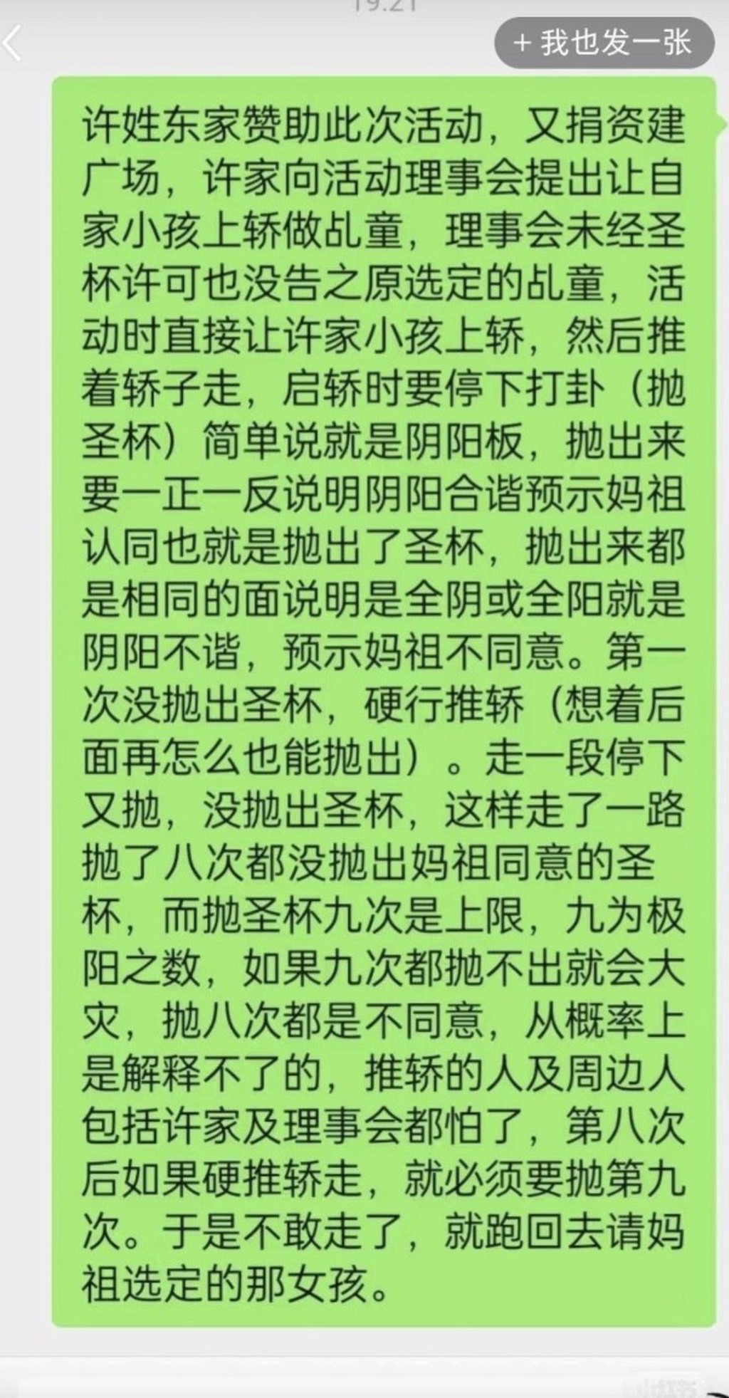 有網友私下透露,主辦方人員甚至對女孩進行強拉硬拽,並以「報復家人」作為威脅,女孩才被迫妥協,含淚登上了神轎。令人驚訝的是,女童擲杯一次就得到了「聖杯」,最終她和男童一起站在轎上,完成了儀式。