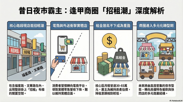 -曾經被視為全台最強夜市商圈之一的逢甲商圈,近期卻出現街頭景象大不同。實際走訪,逢甲夜市周邊街道竟出現整排店面掛上「招租」布條,引發不少人驚呼「逢甲怎麼了?」、「以前不是一位難求?」,也讓外界重新關注逢.. (逢甲商圈, 夜市招租, 高租金, 店面空置, 商圈轉型, ) ...
