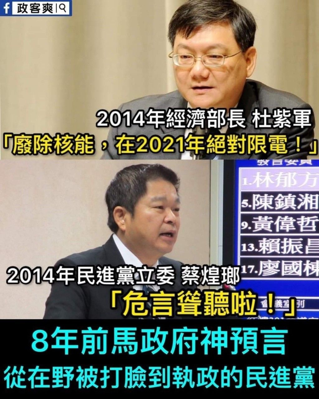 在野支持財劃 執政反對財劃 在野支持國會改革 執政改說國會擴權 在野支持司法改革 執政後黨就是司法 黨就是憲法 在野說總統該到立法院接受質詢 執政後說違憲 在野說消費券債留子孫 執政後發了三次 在野說人通共賣台 執政後共諜都在總統府 順便台積電只送不賣 現在再來個180度大迴轉 黨返核 側翼蟑螂們猝不及防 不只臉被打爛 連頭都被打噴了 來~ 再大聲地說一次 誰才是臭不要臉的雙面人?
