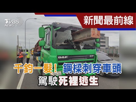車上載運的鋼捲不明原因脫落噴飛,先是砸中了一旁的的騎士,再撞壞路旁電箱。騎士倒