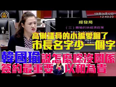 議會報告韓國瑜市長名字又少一個字,高琳議員的小編愛睏了,這時真的需要馬力夯還是蠻牛了 - YouTube 4/12高琳議員議會質詢,報告小插曲,韓國瑜市長少打一個字,變成韓瑜,當下超0.66秒快反應跟市長不好意思.