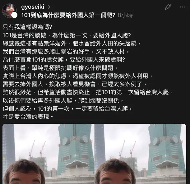 還有的草說為什麼不給台灣人第一個徒手攀爬
