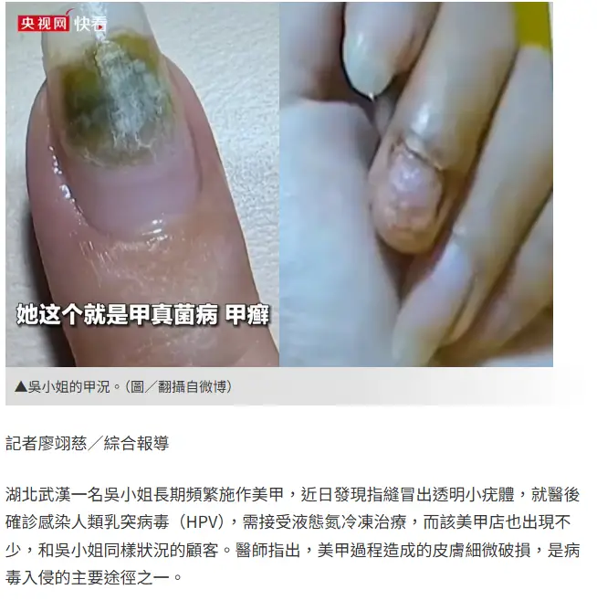 美甲變爛甲!陸美甲店混用工具未徹底消毒…致多人「感染HPV」有沒有可能更噁心 是HPV