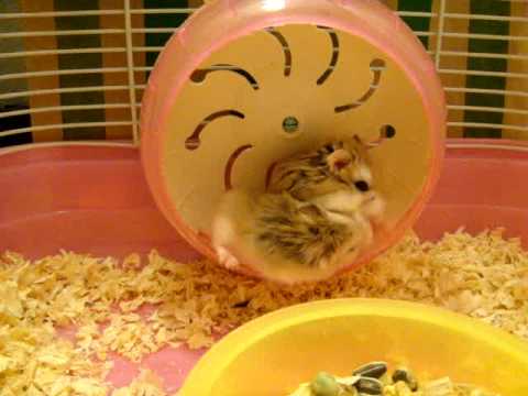 一隻倉鼠在轉盤上運動,另一隻倉鼠也好奇的想一起加入,原本還跑的好好的,可是大概是因為速度跟不上,反而跌倒了,結果兩隻鼠的運動變成一隻鼠的障礙賽跑練習