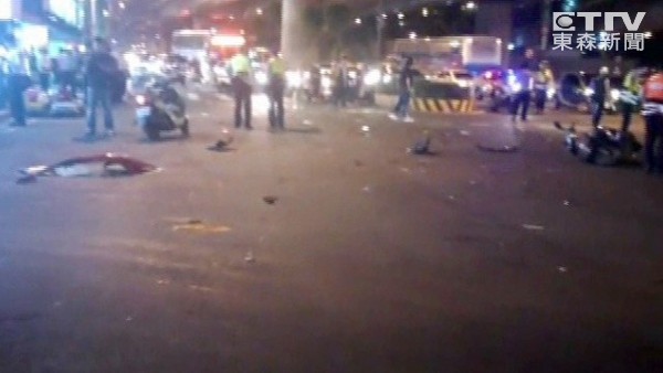 車行經十字路口處,疑因暴衝追撞前方至少6輛機車,造成8人倒地受傷,其中2人送醫無