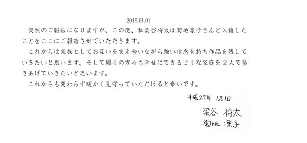 ▲▼染谷將太與菊地凜子2014年被媒體拍到街頭擁吻,2015年1月1日他宣布2人已經登記