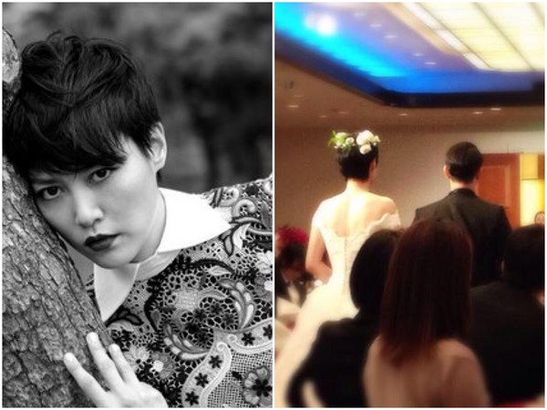 拍下分享至社群網站,照片中他一身黑色的新郎裝扮,新娘則頭戴花冠,穿上露背白色新
