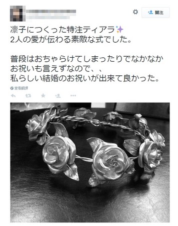 娘禮服,在眾人的祝福下緩緩往前走去。除此之外,飾品設計師YOSHIKO也分享一張玫瑰