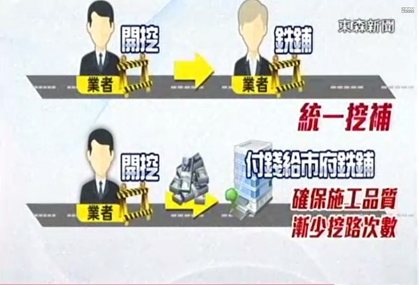 在台北街頭,常常可看到到處鋪路,因為現在常常是一條路,不同管線單位不同時間施工再一次鋪平,而台北市長柯文哲就在選前提出。以後要採統一挖統一補,減少路面坑坑洞洞,而目前北市工務局,也正在規劃建立整合平台,未來的方式就以業者向市府繳錢由市由市府進行統一作業。