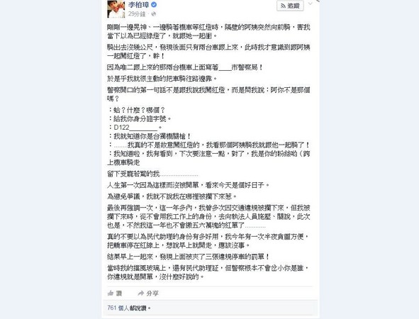 「台獨機關槍」李柏璋25日中午在臉書PO文表示,他騎車停等紅燈時,因為隔壁阿姨突然向前騎,讓他以為綠燈也跟著往前,結果被後方員警攔查,他表示自己不是故意闖紅燈,卻沒想到員警不但認出他,而且還是他的粉絲,最後還說,「我知道啦,我有看到,下次要注意一點。」接著就騎車離開了。(台獨,台獨機關槍,紅單,闖紅燈,李柏璋) ...
