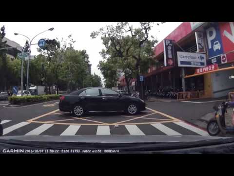 影片3秒左右,對向車道有輛黑色轎車,準備左轉到畫面右側家樂福,不過礙於前方已有