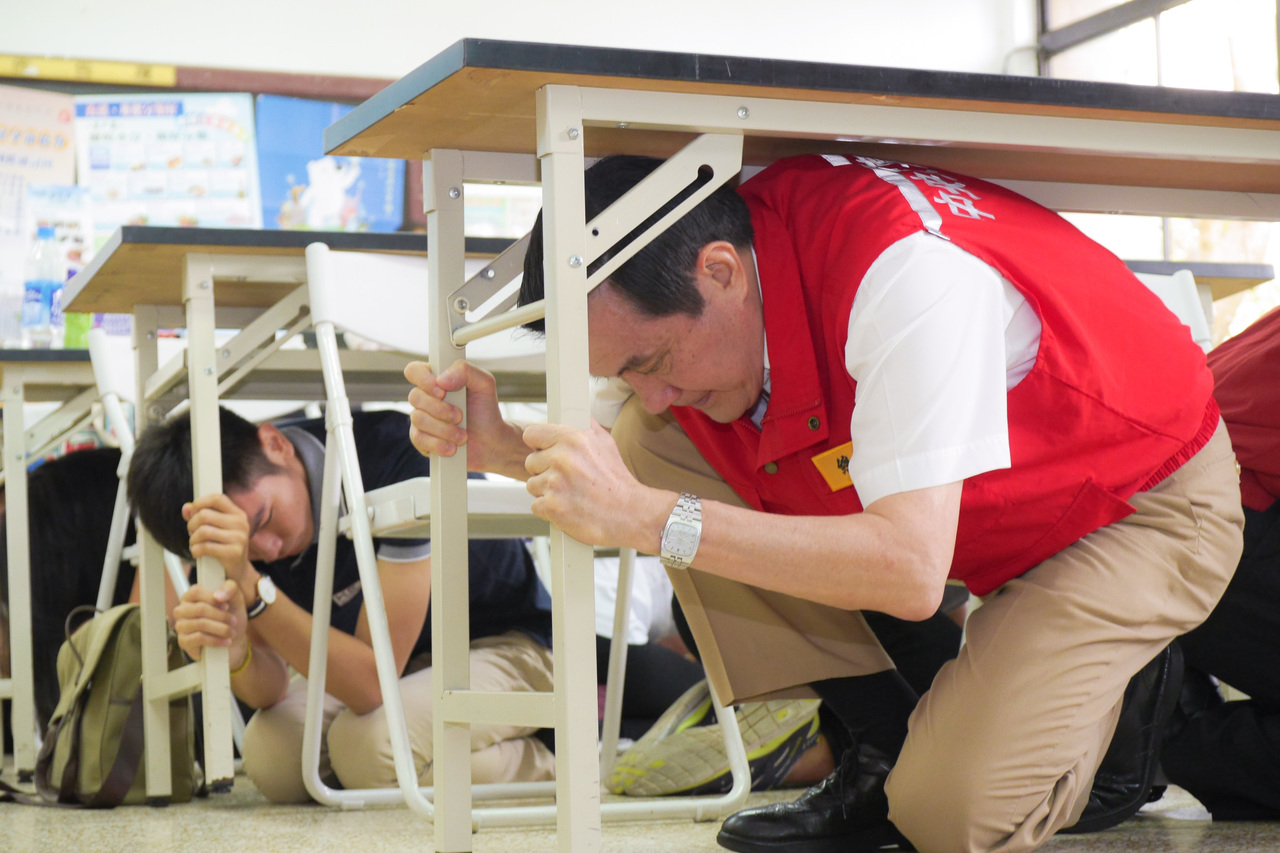當地震發生時萬一人在室內,消防署說,應馬上躲到桌下,並做好「趴下、掩護、穩住並