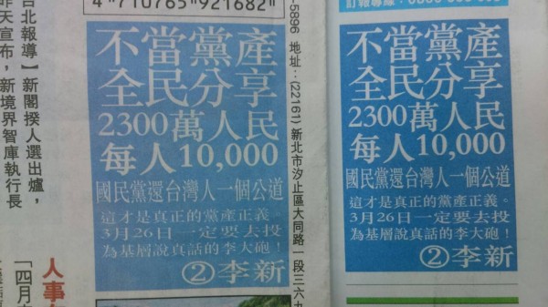 報頭版刊登廣告:『不當黨產,全民分享,2300萬人民,每人1萬元!』也就是說,國民