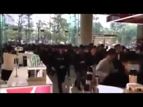 許多年輕人前往東區的專賣店排隊,儘管下著小雨,有人直接舖雨衣坐在地上,不少人還