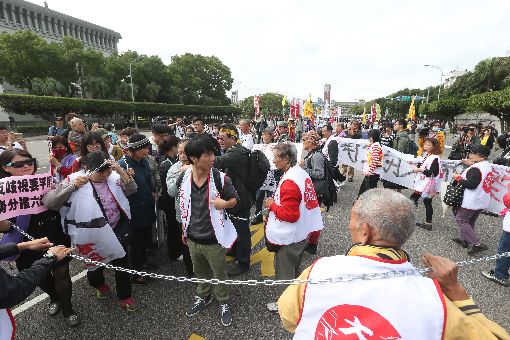以及被砍掉的7天國定假日表達不滿,一路揹著鎖鏈遊行到總統府前凱道,表達被政府壓