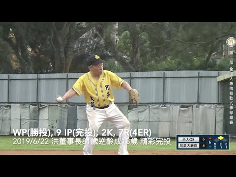 81歲也能完投勝!「職棒之父」,兄弟飯店董事長洪騰勝,在6月22日與台大OB的軟式棒球賽中,一人完投9局失掉7分,只有4分自責分,並送出2次三振,球隊兄弟大飯店也拿下最終的逆轉勝。洪騰勝每年都投入超過千萬元,來舉辦全國大專軟式棒球聯賽,4月結束的第二屆全國大專軟式棒球聯賽,由開 ...