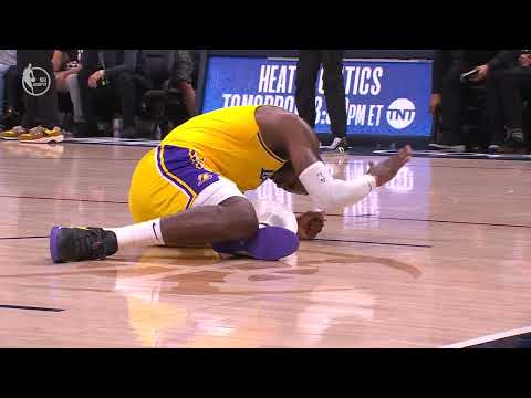 LBJ現在正在綁鞋帶,準備在丹佛金塊隊組織下一次進攻時進行防守。當Schroder對Murray的上籃嘗試犯規時,LBJ在場邊彎腰痛苦地扭曲著表情。他拒絕離場,堅持繼續比賽。
