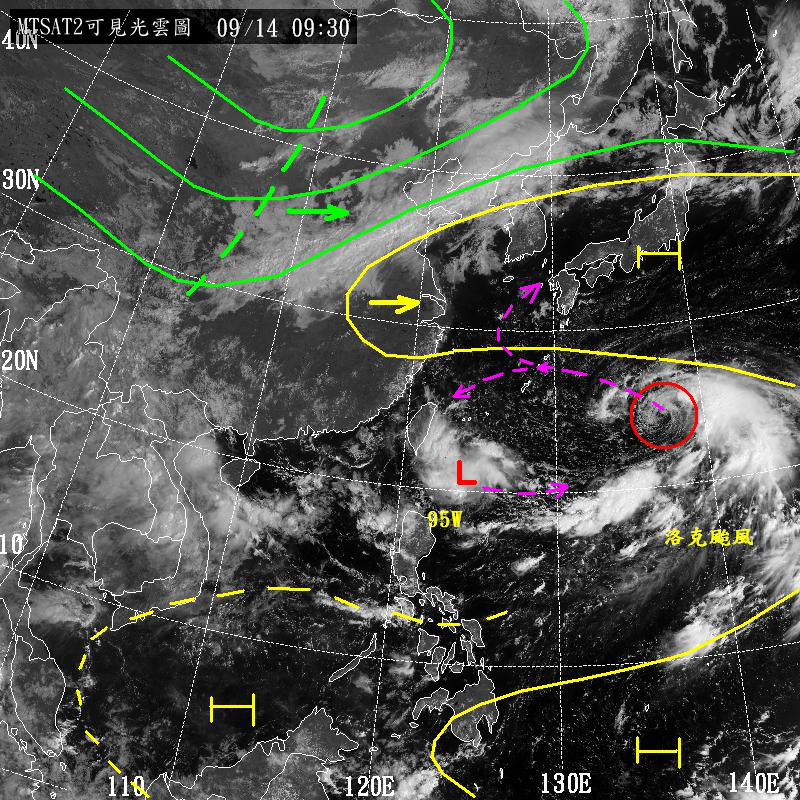 至於台灣東南方海面的低壓(95W)則會慢慢被洛克向東拖出去~