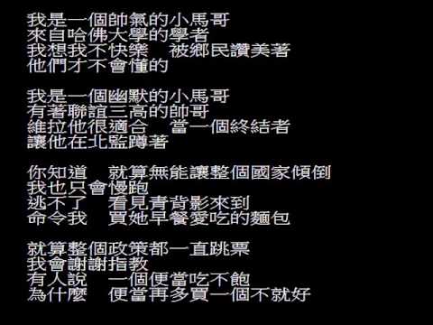 穿到破孔的游泳褲 不甘打損提去補 只要有伊的領導 台灣一定變卡好 請支持英俊小馬哥 暫時來庄腳過日 美青將伊放一邊 啊 虛情來long stay 騙吃騙票騙人情 投票乎伊乎伊乎伊 台灣嗚伊嗚伊嗚伊 油電起 勞保倒去 到底為什麼 選乎北七北七北七 台灣嗚伊嗚伊嗚伊 請鬼來拆藥單 咱的國家沉落去