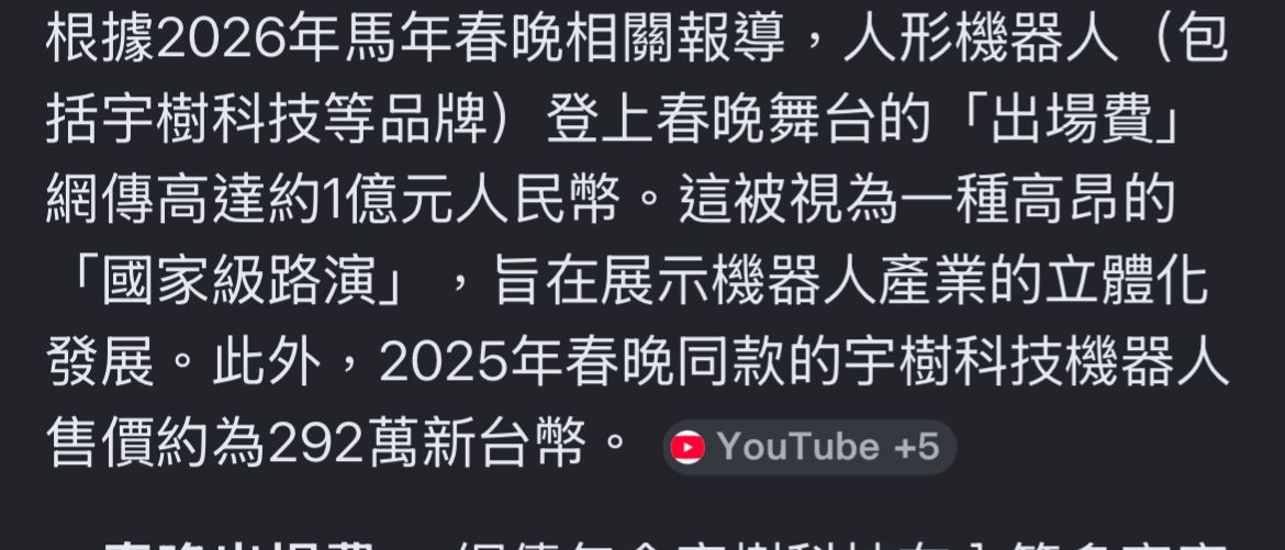 財經新報 作者 姚 惠茹 | 發布日期 2026 年 02 月 18 日 13:16 2026 人形機器人元年!盤點中國四大品牌機器人訂單翻倍釋出投資訊號 火馬年農曆春節,中國央視春晚四大品牌「人形 …122F 45推 13噓- 9F 2推