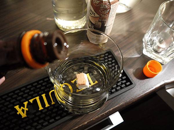 (1)在Old Fashioned杯中放入削切過的方糖,將兩種苦精滴在方糖上
