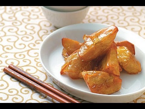 做法:很多食材都可以拔絲,但表面不可以有水分所以必須油炸來去除水分,先把地瓜沾上太白粉,準備熱一鍋油鍋,把地瓜下鍋炸而拔絲必須要溫度很高,糖才能附著在上面,等地瓜炸好後撈起濿乾把油倒出,而拔絲有兩種方式,一種為油拔另一種為水拔,油拔是用油來炒糖這適用在大份量的食材上,而水拔是用水煮融糖這適用小份量的食材上,這邊示範水拔,把糖倒入鍋中後加入水,水份量約糖一半即可,持續攪拌讓糖煮融,不攪拌會讓糖焦掉這樣會苦,注意這攪拌過程會慢慢有大泡泡之後會變金黃色再呈現小泡泡之後會冒煙而泡泡會消失,這時馬上把地瓜放入攪拌這時關火,再來準備盤子而盤子上要擦上一層沙拉油,這樣糖才不會黏在盤子上,把地瓜裝盤後灑上一些白芝麻,再來準備冰水這時地瓜夾起時會有很長的糖絲,再放入冰水中取出後表層糖衣會變硬,這樣就能食用,這樣就完成拔絲地瓜