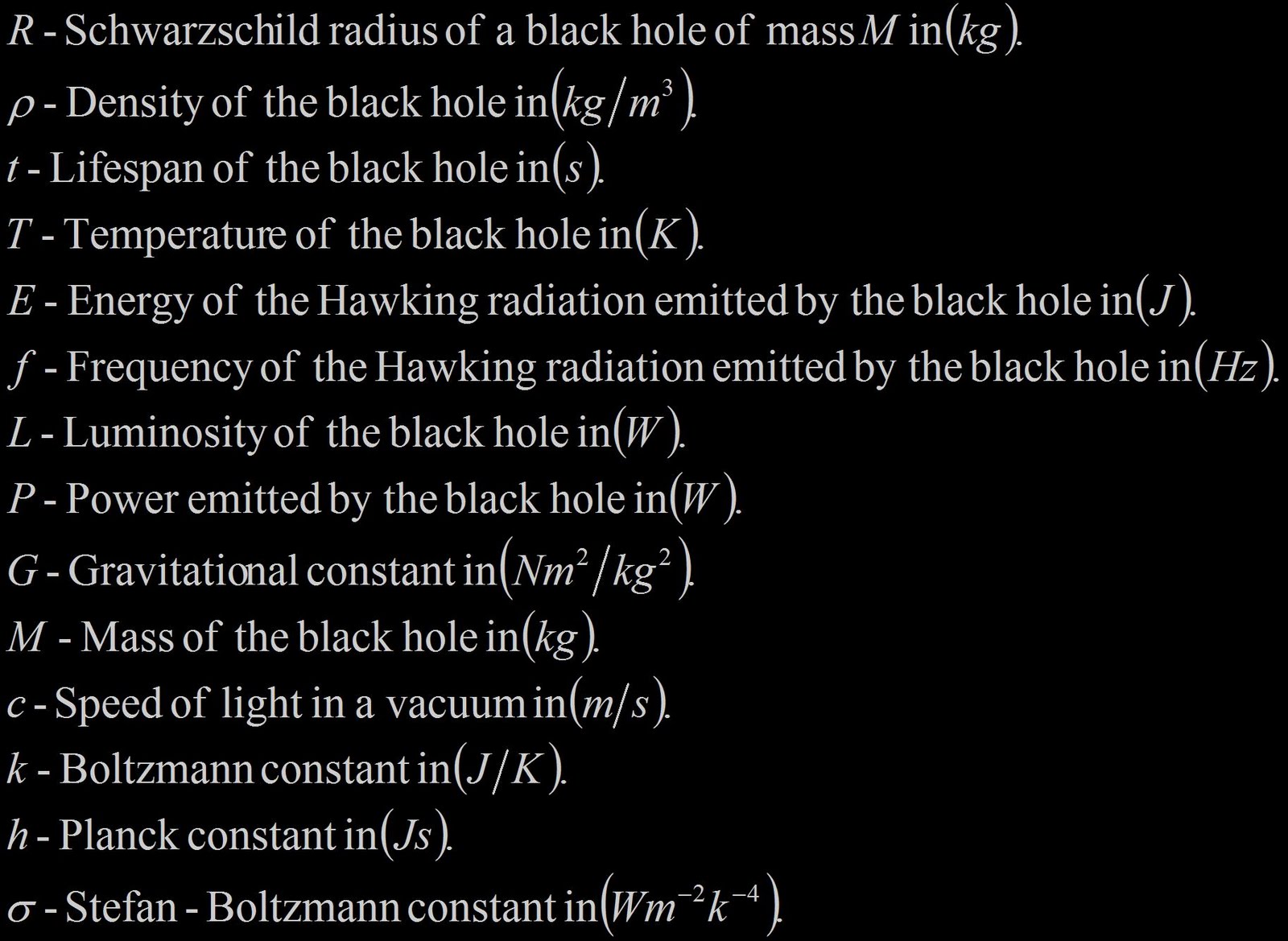 G:重力常數 c:光速 M:黑洞質量 r:在r>2GM/c^2 時候是以黑洞當中心座標半徑