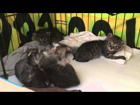 現在小奶貓們已經滿月,會吃飼料也會使用貓砂了,從一開始咿咿喔喔練習走路到現在吵
