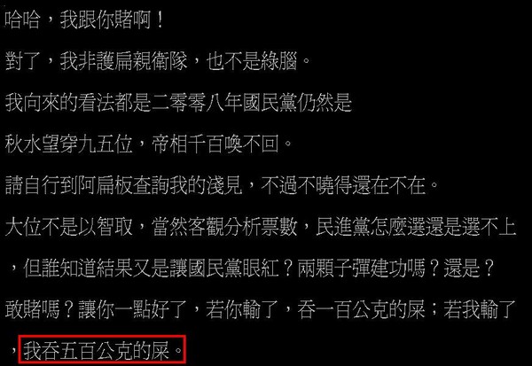 ▼2008年總統大選時,也曾有人表示如果馬英九勝選,就要吃掉500公克的糞便。(圖/翻攝自PTT)