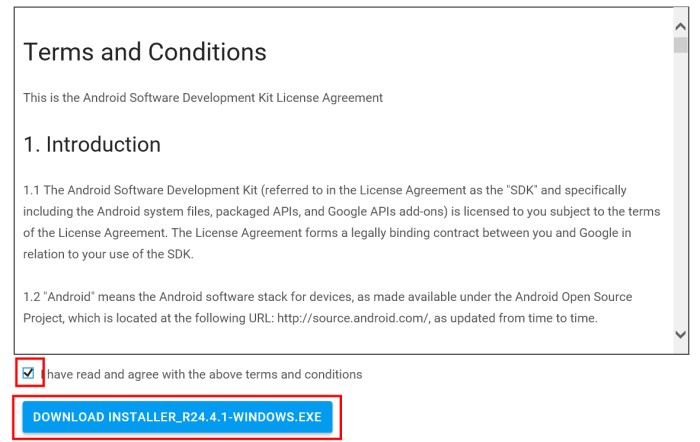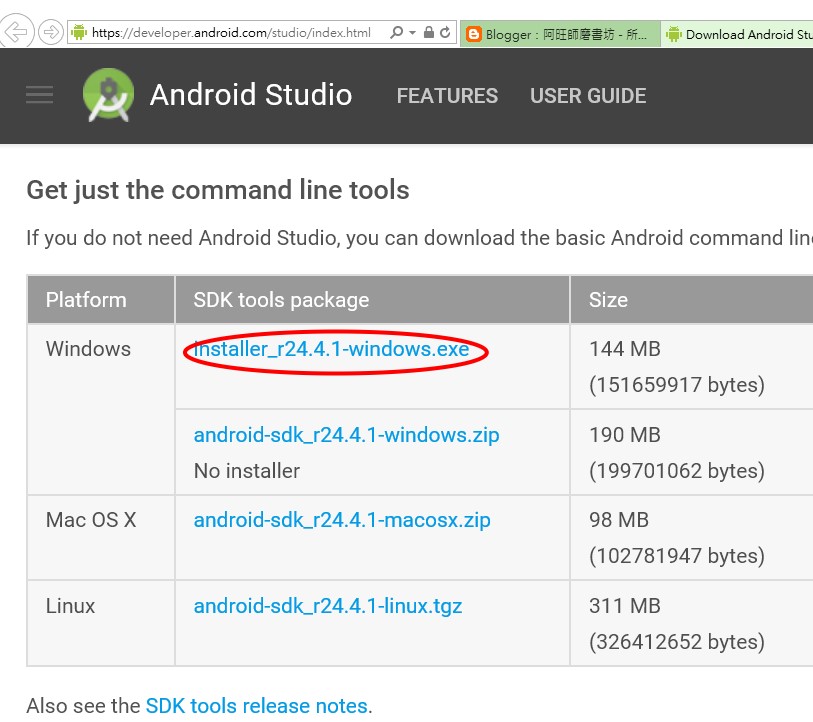 拉垂直捲動軸,移到網頁下面的 SDK tools package,選 「installer_r24.4.1-windows.exe」