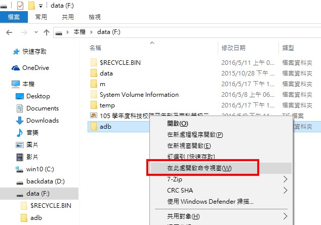 或者叫出檔案總管,shift鍵按住不放,選 f:\adb此資料夾,按右鍵,選「在此處開啟命令視窗」