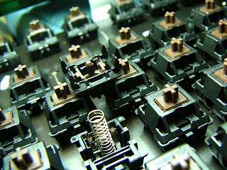 對於一般人來說,所謂的機械式鍵盤,就是打起來會嗒嗒作響,有click聲音感受的鍵盤,事實上這樣的說法並不全是對的。 因為,打起字來,聲音會很大的鍵盤,並不見得是機械式鍵盤,反之,薄膜式鍵盤也不見得都是打起來就是沒有聲音的。 手感如何,聲音大小,其實不完全由鍵盤的原理來決定,是取決於廠商要做什麼樣的機構與設定,正如下壓克數要輕要重,也是一樣的道理。 只是以目前來說,機械式鍵盤的確有極大的比例是有聲音的,而薄膜式鍵盤有極大的比例是無聲的。 (有聲與無聲只是一種比較,而非真正一點聲音都沒有)之所以被稱為薄膜式鍵盤,之所以被稱為機械式鍵盤,所根據的來源,並不在於打字的感受,而是以鍵盤內部Switch(按鍵開關)原理來做分類。 所謂的機械式鍵盤,在底部有PCB板,上面是由100多顆獨立的Switch來進行訊號觸發的動作。 而所謂的薄膜式鍵盤,switch是由三層薄膜所組成,與機械式鍵盤架構是完全不同的兩回事。