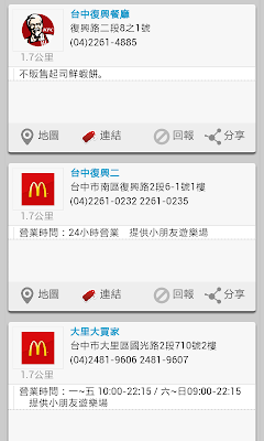 「3秒找速食」:提供最近的麥當當、KFC、MOS,包含訂餐電話、營業時間、有沒有提供