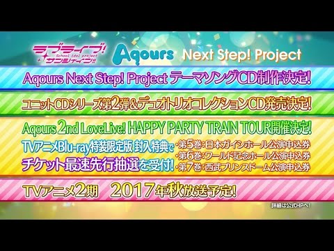 ラブライブ!サンシャイン!! Aqours Next Step! Project 発表PV - YouTube ラブライブ!サンシャイン!! Aqours Next Step! Project 発表PVです。 <Aqours Next Step! Projectとは> すでに発表されているアニメーションPV付3rdシングル「HAPPY PARTY TRAIN」(4月5日発売)をはじめとした、 「ラブライブ!サンシャイン!!...