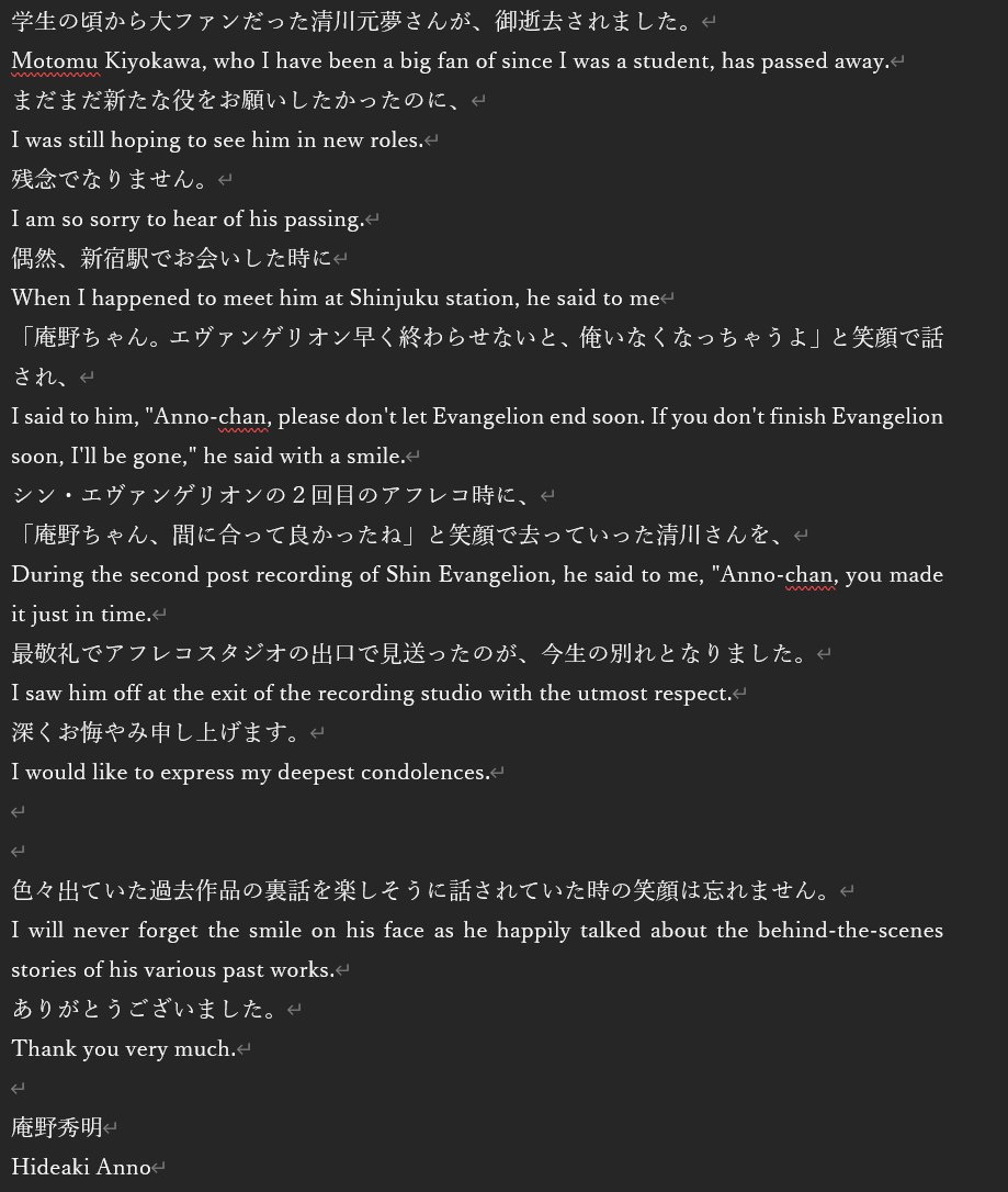 庵野秀明先生透過カラー株式会社推特發的哀悼文,搜了下版上好像沒有人提到,轉發上來