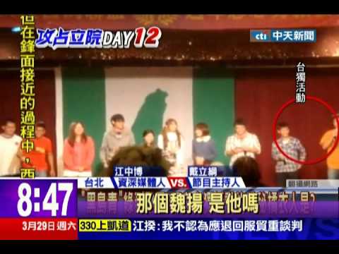 畫面中穿橘色衣服的年輕人,就是在323攻占行政院拿著麥克風登高一呼的那個魏揚。