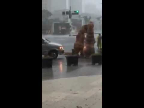 尼伯特颱風現籠罩高雄,高雄帶來豪大雨量,市區更多處積水,水深幾乎半個輪胎高,有網友在爆料公社PO出,有兩人穿恐龍裝現身高雄美術館前的麥當勞路口,恐龍還拿著小雨傘,在路口嬉戲,甚至從路口跑到大馬路。