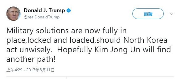 ▼川普對北韓政權的最新嗆聲:砲彈已上膛。