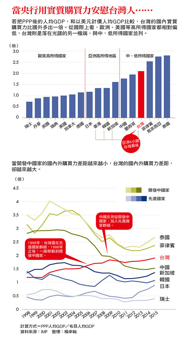 周刊批評央行「阻升不阻貶」、低利率等雙率政策,使出口廠商失去研發與升級的誘因,推升房價,讓台灣低薪、低物價,形成購買力幻覺,扭曲台灣經濟。央行總裁彭淮南昨天澄清,台灣有完善健保、油電費、學費、交通費也相對低廉,生活成本相對便宜,生活費用低於南韓,這些是事實而非幻覺。 ...