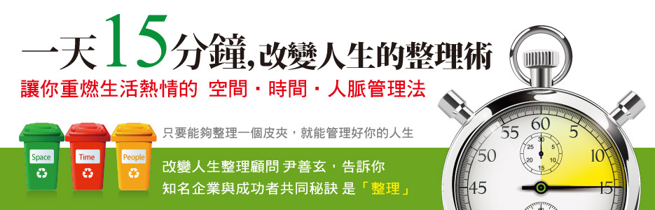 符合的項目越多,要越快開始整理工作,這些題目代表了工作者在三種面向上的整理實踐力:「空間」、「時間」與「人脈」,你可以選擇從任何一種面向開始著手,但是養成每日輕鬆整理的方法當中,有一項是每天設定十五分鐘的整理專屬時間,建議開始時別超過這個時間長度,允許自己花15分鐘就好,但每天都要實踐!