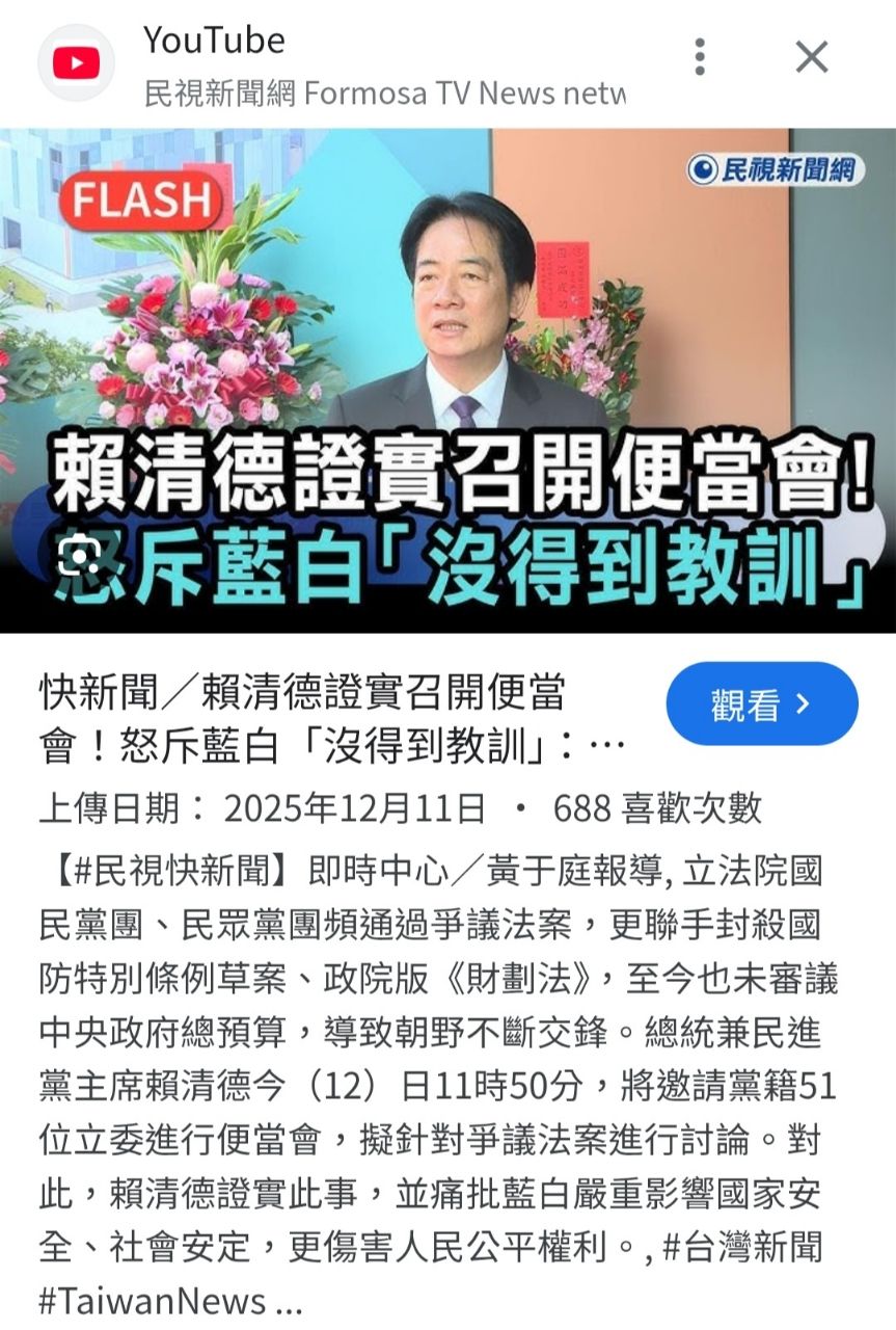 : 距離12月31日只剩最後6天,中央政府總預算還卡在立法院無法審議。對此,總統賴清德